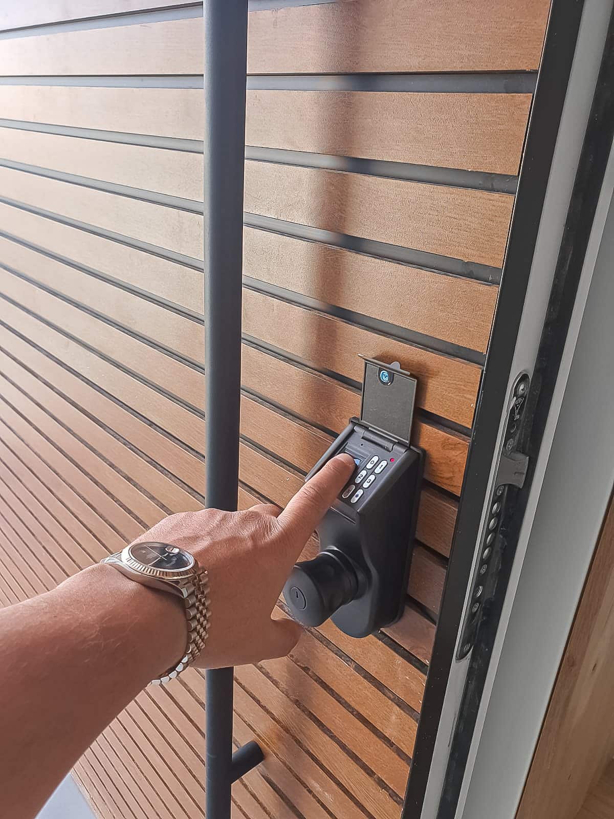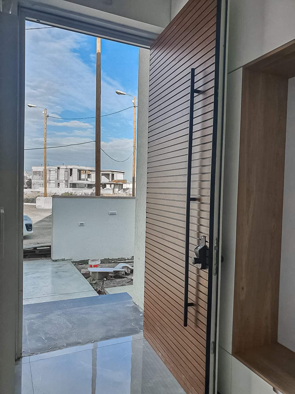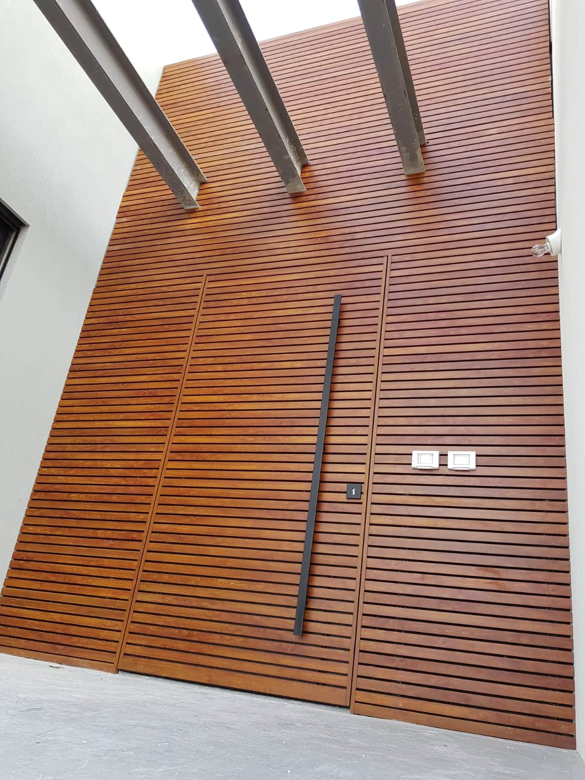 כניסה מושלמת שהתקנו בוילה ברחובות בה הכל מתחבר כמו שצריך: דלת קו 0 היוצרת 'אשליה אופטית' של מפתח כניסה עצום בעיצוב דמוי עץ, חיפוי גבוה ומרשים בגובה 6 מטרים (!!!), ידית מינימליסטית באורך 1.80 והדובדבן שבקצפת – מנגנון טביעת אצבע לבטיחות מקסימלית.